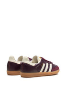 Adidas Samba OG Maroon Gold Metallic (W) wyróżniają się głębokim burgundowym odcieniem, który w połączeniu ze złotymi detalami i kremowymi akcentami nadaje butom elegancki, retro charakter. Całość dopełnia klasyczna gumowa podeszwa, która kontrastuje z górną częścią i podkreśla styl vintage.