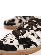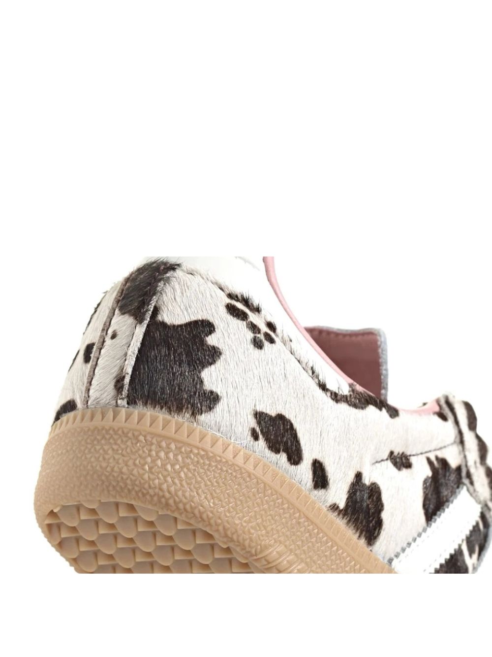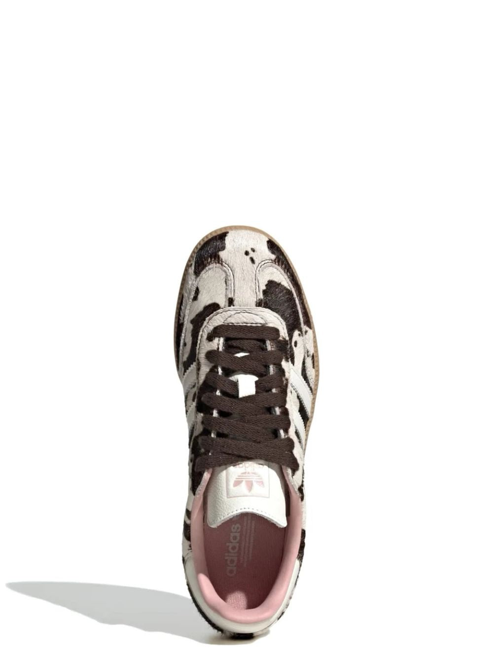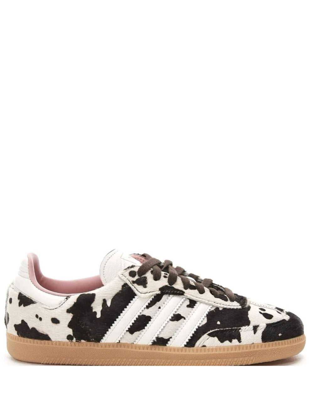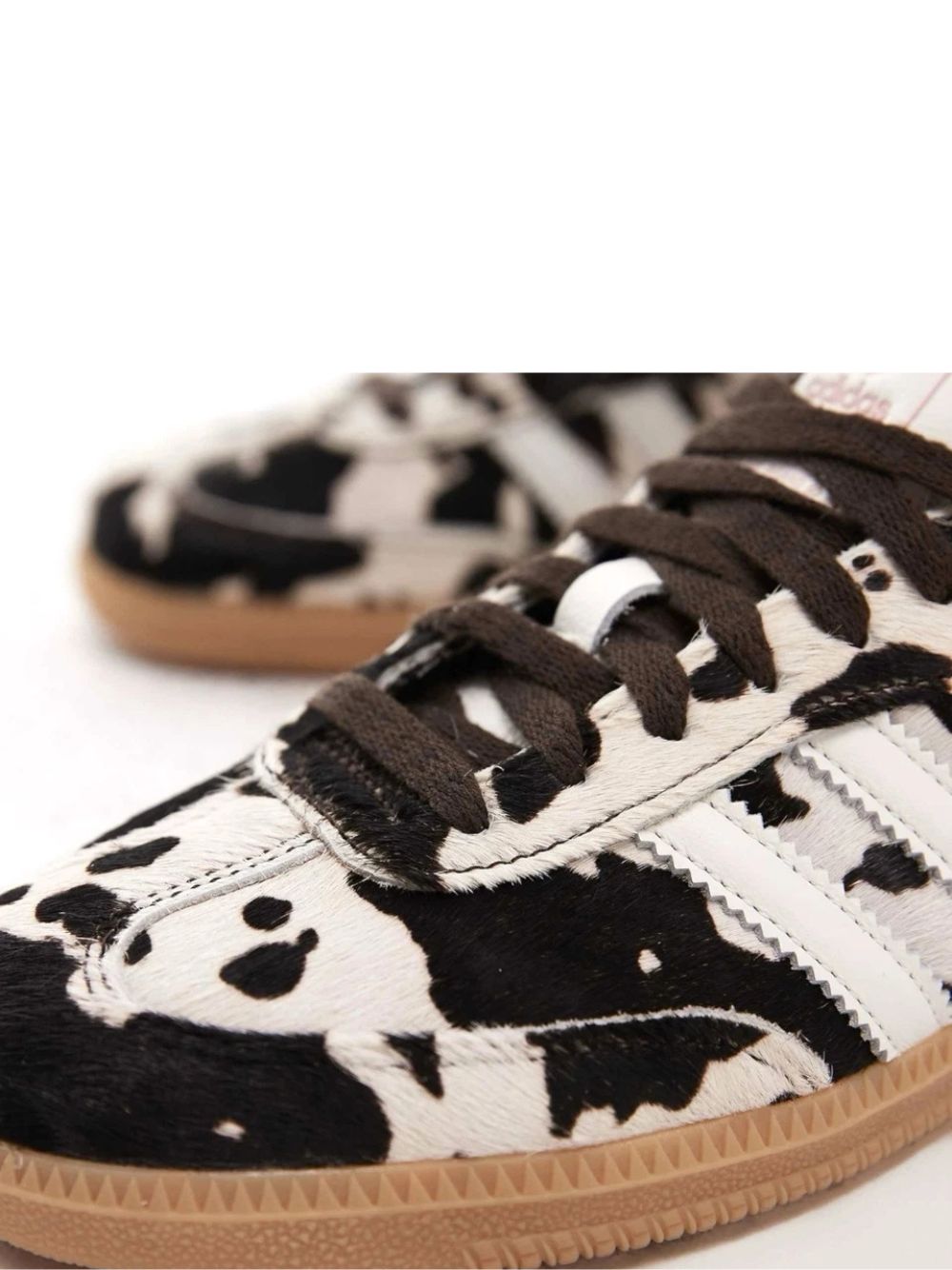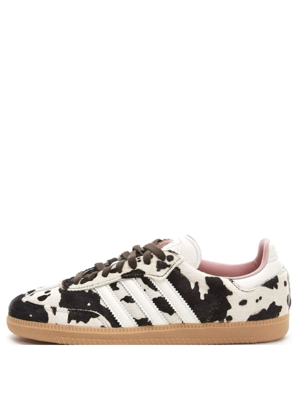 Adidas Samba OG Cow Print (W) to odważna propozycja, która wyróżnia się nietuzinkową kolorystyką – kontrastowy print w stylu krowiej skóry w czerni i bieli przyciąga wzrok i nadaje butom niepowtarzalny charakter. Różowe wnętrze dodaje subtelnego, kobiecego akcentu, a klasyczna gumowa podeszwa podkreśla retro vibe modelu.