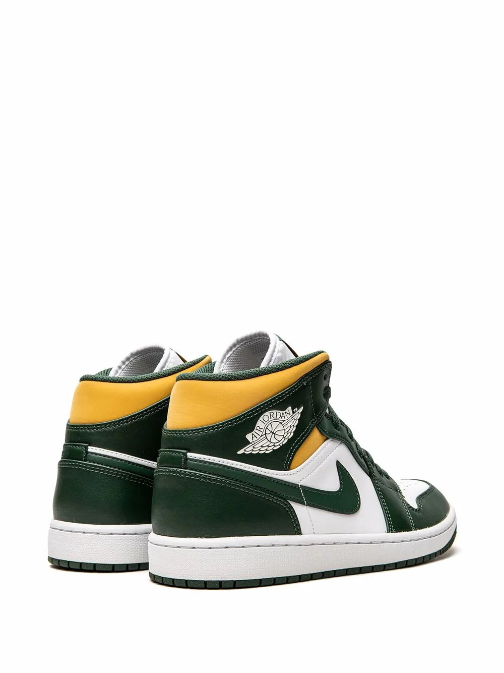 Air Jordan 1 Mid Sonic to dynamiczne sneakersy inspirowane barwami legendarnej drużyny Seattle SuperSonics, łączące klasyczny design z koszykarską historią. Cholewka wykonana z wysokiej jakości skóry zestawia głęboką zieleń, biel i żółte akcenty, nawiązując do ikonicznych strojów zespołu z lat 90. Perforowany toebox zapewnia wentylację, a biała środkowa podeszwa i zielona gumowa podeszwa gwarantują wygodę i przyczepność. Branding Jumpman na języku i klasyczne logo Wings na kołnierzu podkreślają autentyczność modelu. Kolorystyka Sonic to świetna propozycja dla fanów koszykówki i sneakersów nawiązujących do ery świetności NBA.