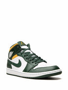 Air Jordan 1 Mid Sonic to dynamiczne sneakersy inspirowane barwami legendarnej drużyny Seattle SuperSonics, łączące klasyczny design z koszykarską historią. Cholewka wykonana z wysokiej jakości skóry zestawia głęboką zieleń, biel i żółte akcenty, nawiązując do ikonicznych strojów zespołu z lat 90. Perforowany toebox zapewnia wentylację, a biała środkowa podeszwa i zielona gumowa podeszwa gwarantują wygodę i przyczepność. Branding Jumpman na języku i klasyczne logo Wings na kołnierzu podkreślają autentyczność modelu. Kolorystyka Sonic to świetna propozycja dla fanów koszykówki i sneakersów nawiązujących do ery świetności NBA.