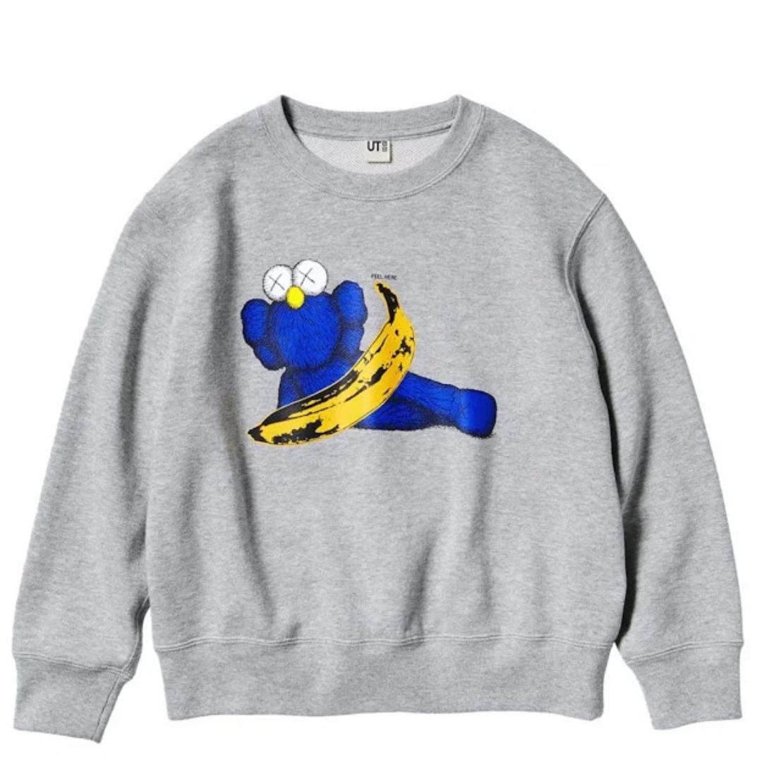 KAWS x Uniqlo x Andy Warhol Banana Crewneck – szara bluza z unikalną grafiką: postać KAWS trzymająca kultowego banana Warhola. Z tyłu haft „XX” w kontrastowym kolorze. Limitowana kolaboracja w streetwearowym wydaniu.