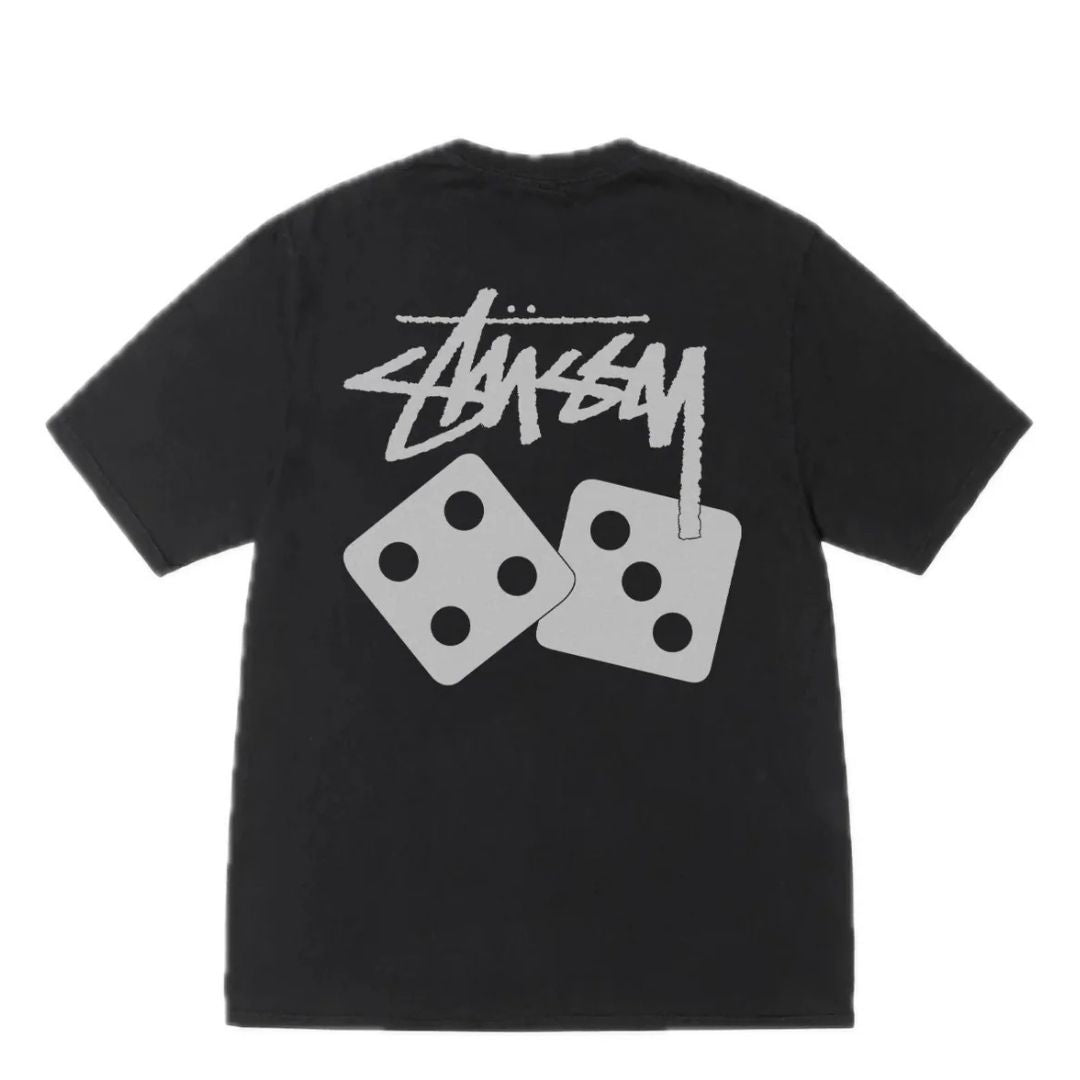 Stüssy Dice Tee Black to wyrazisty T-shirt w stylu vintage, wykonany w technice pigment dye. Na plecach duże kostki do gry z logo Stüssy, z przodu minimalistyczny nadruk. Idealny wybór dla fanów klasycznego streetwearu z charakterem.