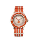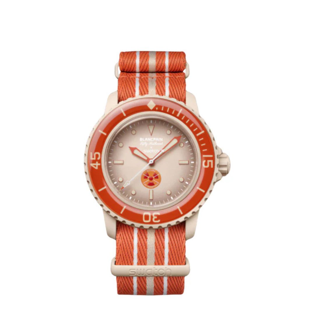 Swatch x Blancpain Scuba Fifty Fathoms Arctic Ocean wyróżnia się intensywną pomarańczą inspirowaną arktycznymi wodami i ekstremalnymi warunkami. Bioceramiczna koperta, tekstylny pasek NATO i automatyczny mechanizm to połączenie stylu i funkcjonalności w kolekcjonerskim wydaniu.