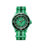 Swatch x Blancpain Scuba Fifty Fathoms Indian Ocean to dynamiczny zegarek inspirowany barwami oceanu i naturą. Zielona koperta z bioceramiki i pasek NATO tworzą wyrazisty, sportowy styl. Mechanizm automatyczny, wodoodporność i lekka konstrukcja sprawiają, że to idealny wybór na co dzień i do kolekcji.