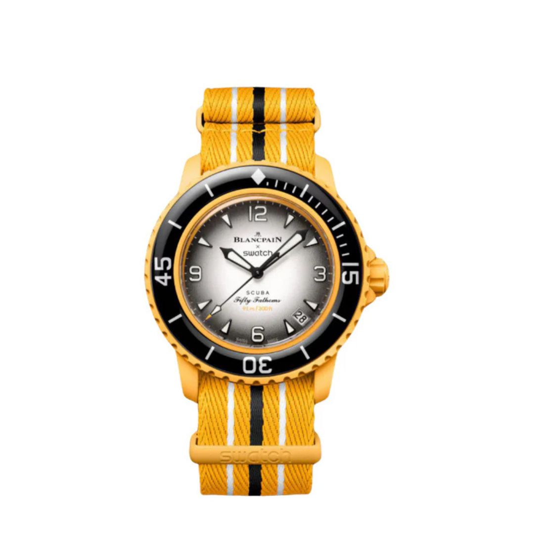 Swatch x Blancpain Scuba Fifty Fathoms Pacific Ocean to model inspirowany spokojem i barwami Pacyfiku. Żółta koperta z bioceramiki, gradientowa tarcza i pasek NATO tworzą wyjątkowy projekt z automatycznym mechanizmem, łączący nowoczesny styl z funkcjonalnością zegarka do nurkowania.