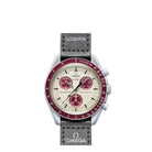 Swatch x Omega Bioceramic Moonswatch Mission to Pluto – wyjątkowy model inspirowany tajemniczą planetą karłowatą. Jasna tarcza z bordowymi akcentami w połączeniu z ciemnym paskiem tworzy niepowtarzalny, kontrastowy design. Zegarek wykonany z lekkiego i trwałego materiału bioceramicznego – stylowy dodatek dla kolekcjonerów i miłośników unikalnych projektów.