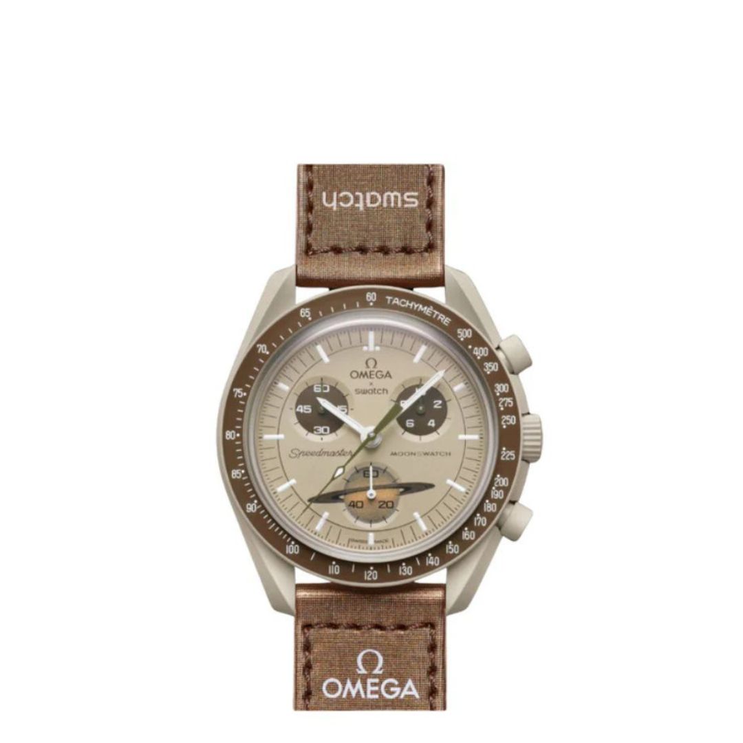 Swatch x Omega Bioceramic Moonswatch Mission to Saturn – klasyczny zegarek w stonowanej, beżowo-brązowej kolorystyce inspirowanej szóstą planetą Układu Słonecznego. Model wyróżnia się eleganckim designem, subtelnymi detalami i pierścieniem Saturna na subtarczy. Wykonany z lekkiego, innowacyjnego materiału bioceramicznego – idealny dla fanów stylu i kosmicznych projektów.