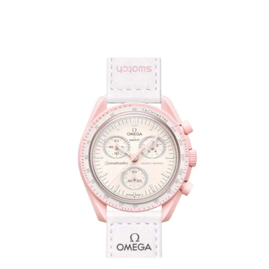 Swatch x Omega Bioceramic Moonswatch Mission to Venus – subtelny i elegancki model w delikatnym różu, nawiązujący do planety Wenus. Wykonany z lekkiej bioceramiki, przyciąga wzrok i świetnie komponuje się z codziennymi oraz bardziej stylowymi zestawami.
